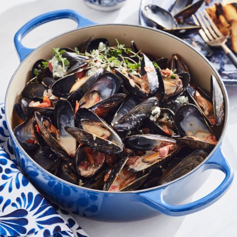 This hearty seafood dish comes to us from Chef Diego Galicia, named one of Food & Wine magazine’s Best New Chefs in 2017. Blue cheese might seem like an unusual pairing for mussels, but it adds a welcome tang and creamy richness. The recipe calls for PEI mussels, which is the abbreviation for Prince Edward Island, where the shellfish originated. Prized for being plump and tender with a sweet flavor, they’re easy to find in grocery stores and fish markets in the United States. Serve toast points or a crusty baguette alongside to soak up all the sauce.