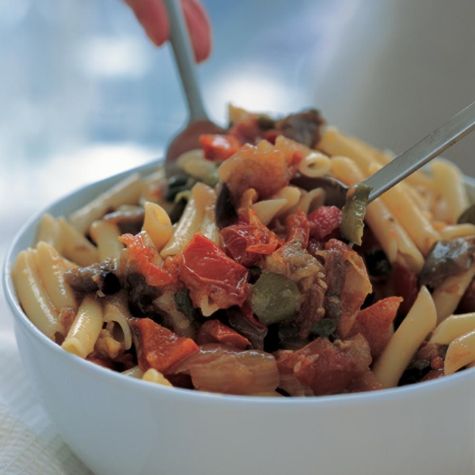 Bring a large pot of water to a boil over high heat. Add the 2 Tbs. salt and the pasta. Cook, stirring occasionally to prevent sticking, according to the package instructions until al dente (tender but firm to the bite). Drain the pasta, return it to the pot and toss with the 2 cups ratatouille. Adjust the seasonings with salt and pepper and serve immediately. Serves 4; makes 12 cups ratatouille total.