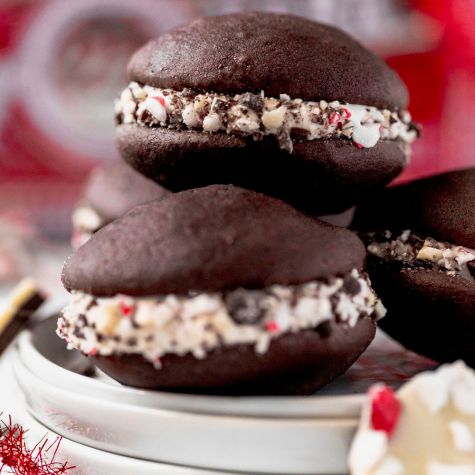 Next, assemble the whoopie pies. Using a spoon, drop 1 1/2 to 2 tablespoons of filling on the bottom side of one cookie. Top with another cookie and gently press until the filling reaches the edge of the cookies. Roll the edges of the whoopie pies in the Peppermint Bark pieces. Repeat with the remaining cookies. The whoopie pies can be stored in an airtight container in the refrigerator for up to 5 days. Makes about 16 whoopie pies.