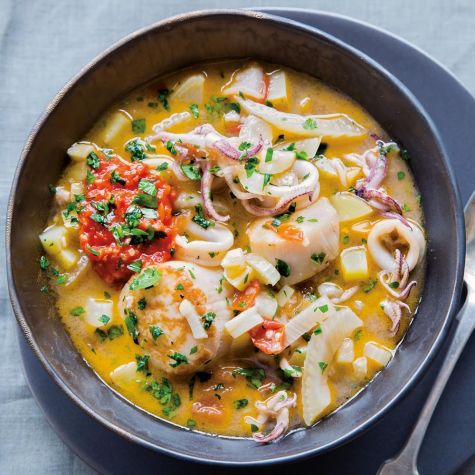 Although it features the classic flavors of Provençal bouillabaisse, this stew is a bit lighter, thanks to a rouille that has less oil than the traditional version and gets it bright color and flavor from naturally sweet bell peppers. Plump scallops entice even the wariest of seafood eaters, with their mild, slightly sweet flavor.