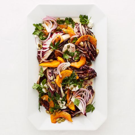 In the same pan over medium heat, warm the remaining 1 Tbs. olive oil over medium heat. Add the onion and sauté until just tender, about 3 minutes. Stir in half of the dressing and remove from the heat. Add the radicchio, squash and remaining dressing to the pan and toss gently to coat. Season with salt and pepper and transfer to a serving platter. Sprinkle with the pepitas and goat cheese, garnish with the parsley and serve immediately. Serves 4.
