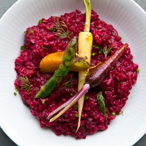 Ray Garcia, chef at FIG restaurant, created this gorgeous vegetarian dish, which derives its crimson color from pureed beets.