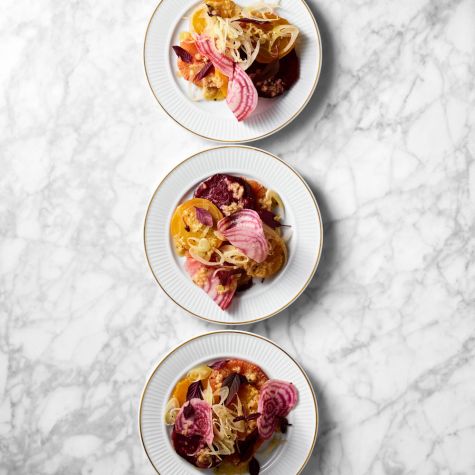 On a large platter, layer the red and golden beets, grapefruits, orange and fennel with the baby greens. Garnish with the raw Chioggia beet slices and fennel fronds.