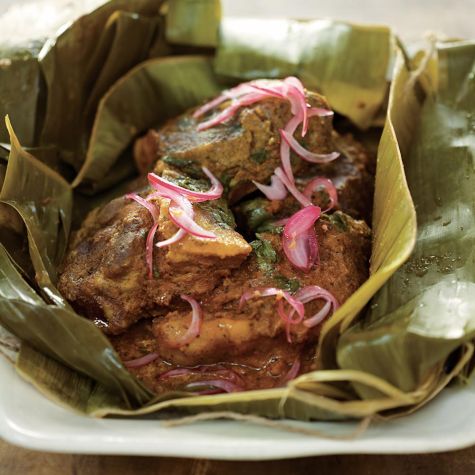 Made in the traditional way, as it is in Mexico’s Yucatán peninsula, cochinita pibil starts with large pieces of bone-in pork rubbed with a spice paste anchored by fragrant red annatto seed and sour orange. The meat is then wrapped in banana leaves and roasted on hot rocks in a deep pit (pib) until meltingly tender and infused with the earthy flavors of the spices and grassy fragrance of the banana leaf. Achiote paste and banana leaves can be found at most Latin markets.