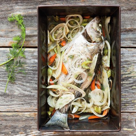 Bake, basting occasionally with the pan juices, until the fish is opaque throughout and an instant-read thermometer inserted into the thickest part of the fish behind the head registers 140°F (60°C), about 30 minutes. Garnish with the dill sprigs and serve directly from the dish. Serves 4.