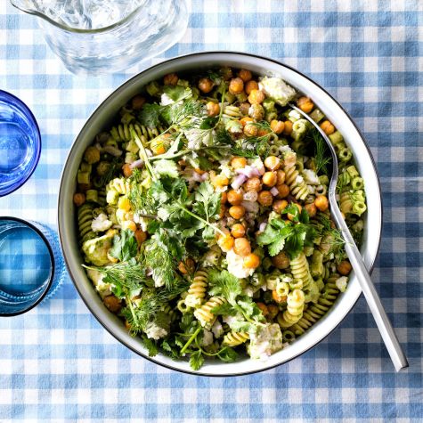 Green Tahini Pasta Salad with Feta and Fried Chickpeas