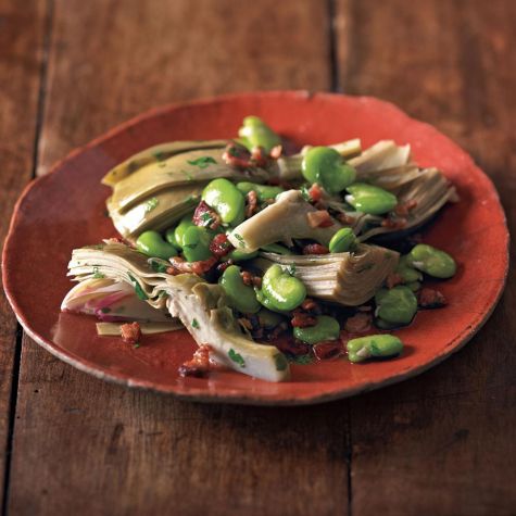 In Italy, fresh artichokes, both green and purple, start to appear in the markets in March. There they are arranged in beautiful piles and look like giant bouquets of flowers. In the United States, artichokes are likely to start appearing in farmers’ markets in April, which means they are the perfect partner for another early spring crop, fava beans. Here they are combined in a simple dish that gets its extra depth of flavor from finely diced pancetta.