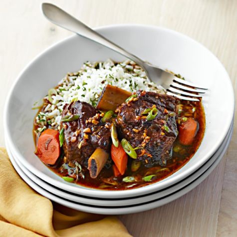 Fresh ginger lends a refreshing note to braised beef short ribs. Here, the dish is prepared in a Cuisinart multicooker. Alternatively, you can sear the ribs in a Dutch oven on the stovetop, then cover the pot and cook in a 300°F oven until the meat is very tender, about 3 1/2 hours. Be sure to skim the excess fat off the cooking liquid before serving—it’s even easier if you let the meat and sauce cool slightly.