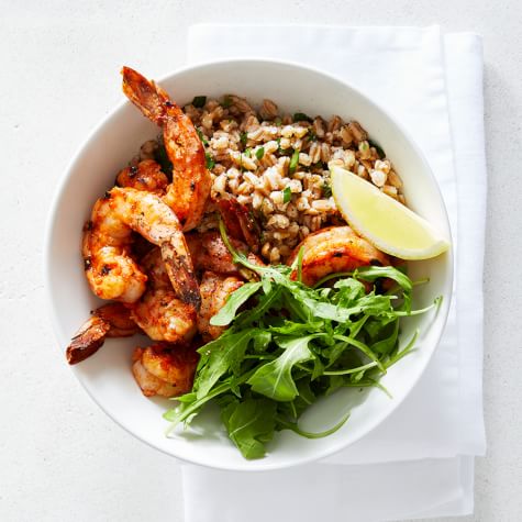 A staple in Italy, the wholesome, nutty-tasting grain known as farro takes well to a host of preparations. Here we toss it with peppery arugula and add pan-seared shrimp, which gets a flavor boost from Gaby Dalkin’s Roasted Red Pepper Artichoke Everything Sauce. Handcrafted in small batches, this versatile blend was created by the inspiring California chef, cookbook author and food blogger behind What’s Gaby Cooking. Be sure to cook the farro just until it is al dente—you want the grains to retain a little chew.