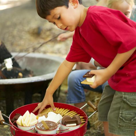To make each s’more, place a piece of chocolate on a graham cracker square, top with a roasted marshmallow, set a second graham cracker square on top, and squish the marshmallow and chocolate together to make a gooey sandwich. Makes 24.