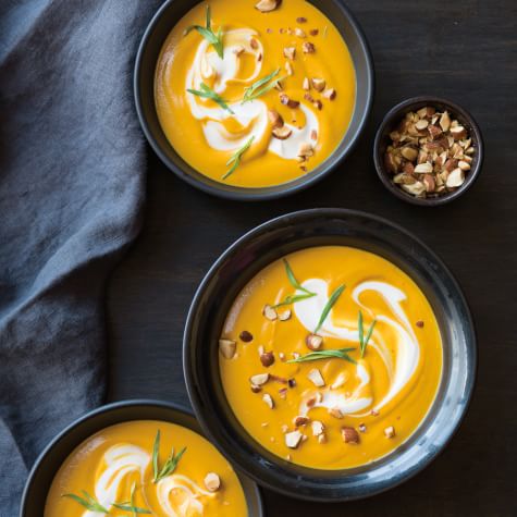 Heat the soup on the stove top over medium-high heat until piping hot. Stir in the orange zest. Taste and adjust the seasoning with salt and black pepper. Divide among individual bowls, garnish with the crème fraîche, tarragon and almonds, and serve immediately. Serves 6.
