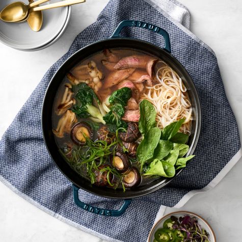 Strain the broth and discard the solids. Return the strained broth to the Dutch oven along with the tamari. Over low heat, gently simmer the broth for 15 minutes, then add the marinated mushrooms and simmer for a few more minutes. In a medium, heat-proof bowl add the miso. Ladle 2 cups (16 fl. oz./500 ml) of hot broth into the bowl with the miso and stir until combined. Add the miso mixture to the Dutch oven and simmer for 5 minutes. Season to taste with more tamari, if desired. Cover and keep warm until ready to serve.