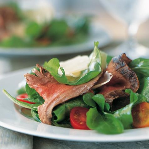 Thinly slice the steak across the grain. In a large bowl, combine the arugula, tomatoes and steak. Add the vinaigrette and toss well. Using a vegetable peeler, shave curls of the cheese over the salad. Divide among large plates and serve immediately. Serves 4 to 6.
