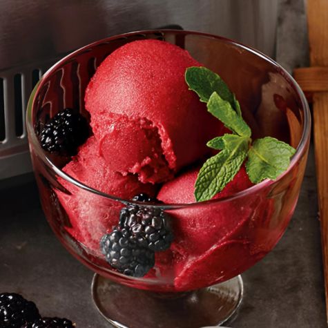 Light in texture with an intense fruit flavor, a sorbet is made by incorporating air into a sweetened fruit puree or juice as it freezes in an ice cream maker. Sorbets contain no eggs or dairy products. This version combines two types of berries to create a refreshing summer treat.