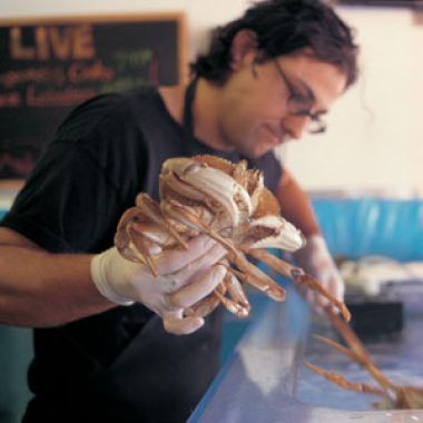Like lobsters, crabs must be kept alive until cooking, after which their shells turn bright red. They are a little trickier to eat than lobsters, although in crab-eating regions such as Charleston and Maryland's eastern shore, folks think nothing of the messy task. In other parts of the country, many people prefer buying the sweet, velvety crabmeat already cooked and removed from the shell, although the flavor will be better if you extract the meat yourself. On the West Coast, Dungeness crab is usually sold cooked but still in the shell, although it is possible to buy the giant shellfish live for cooking at home. Alaskan king crab and snow crab are nearly always sold cooked and frozen except in Alaska, where they can be bought frozen.