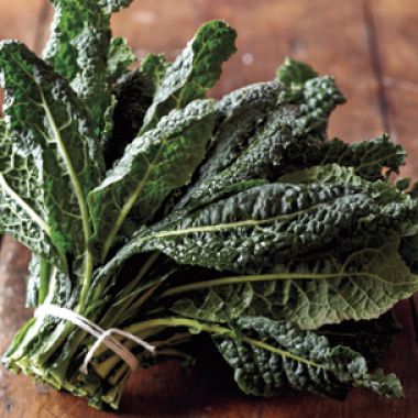 Kale, a member of the cabbage family, has firm, tightly crinkled leaves on long stems. The green, sturdy leaves have an earthy flavor similar to cabbage and keep their texture well when cooked. Italian varieties have narrower, more tapered leaves, while dinosaur kale (also called cavolo nero) can be recognized by its dark green color.