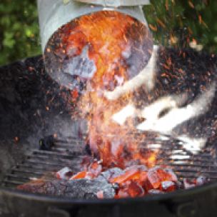 2. After 15 to 20 minutes, the coals will be covered with gray ash and glowing. Remove the grill grate from the grill and pour the coals onto the fire bed.