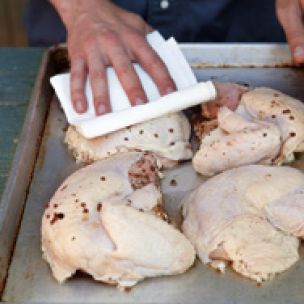 Don’t forget this step before you throw the chicken on the grill. Patting the pieces dry with paper towels helps the surface caramelize, which is the slight charring that takes place once the meat hits the heat. If the surface is moist from a brine or marinade, it will steam rather than sear, and you’ll miss out on that tasty caramelization.