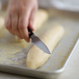 Keeping the knife at an angle, make 2 to 5 slits depending on the shape of your dough, or according to your recipe