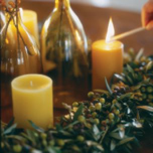 Place a purchased wreath made of olive branches, laurel, rosemary, evergreen boughs or other fresh foliage in the center of the table. Gather some unscented pillar candles around the edges and place a cluster of amber-colored glass vases in the center. Arrange sprigs of foliage, berries or vines in each vase, using only a few branches to avoid blocking sight lines across the table.