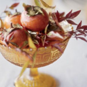 Arrange persimmons, miniature apples, pears or other seasonal produce in a decorative glass dish or bowl. Cut sprays of colorful autumnal foliage and insert the cut ends between the fruit.