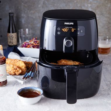 For optimal results, don’t overfill the cooking basket (some baskets have a “max” line to indicate the maximum capacity), and always cook food in a single layer. When cooking foods with a higher fat content, such as skin-on chicken pieces, occasionally remove the cooking basket and drain the excess fat from the bottom of the air fryer. Finally, the air fryer should be cleaned after each use to remove the oil and prevent smoke from building up the next time you use it. After the air fryer cools completely, wipe the outside of the unit with a moist cloth. Remove the cooking accessory and set aside. Thoroughly clean the interior of the appliance with hot, soapy water and a nonabrasive sponge, then let dry completely before storing. All of the accessories are dishwasher safe.