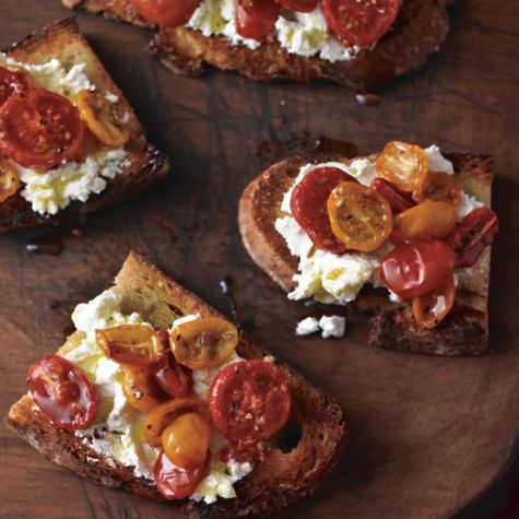In Italy, a favorite snack is a thick slice of bread rubbed with tomato and seasoned with olive oil and salt. Here, that satisfying combination is enhanced with creamy fresh ricotta and roasted cherry tomatoes.