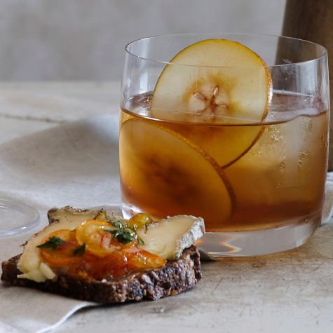 Though it couldn’t be simpler to make, an old-fashioned is an elegant drink to kick off the evening, especially when it’s served on a single large cube of ice. Here we’ve swapped out the traditional Angostura bitters for vanilla bitters and garnished the drink with thin slices of pear to put an autumnal spin on it. If you like, you can omit the pear slices and garnish the drink with a vanilla bean instead.