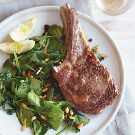 Veal rib chops carry quite a bit of fat along the bone, and if you were not stuffing them, you might be tempted to ask the butcher to french the bones. But here that extra surface area is needed to accommodate the herb and lemon stuffing. You can trim away the fat from the bones before serving, if desired. Wilted baby spinach tossed with toasted pine nuts and dried currants makes a delicious accompaniment.