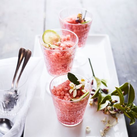 Originating in Sicily, the frozen dessert known as granita is popular throughout Italy. It’s easy to make and is a wonderful way to showcase whatever fruit is in season, as with our watermelon version that gets a flavor boost from a basil-infused sugar syrup. Garnish this icy treat with a slice of lime or a sprig of fresh basil, if you’d like.