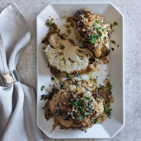 This whole cauliflower is an impressive side dish that will grab the attention of your guests, yet it’s really quite simple to make. The bread-crumb topping lends crunch and fresh herbal flavor.