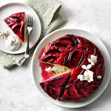 Perfect for summer potlucks and backyard barbecues, this upside-down cake showcases juicy plums at their seasonal best. Our recipe calls for red plums, which bring a deep crimson hue to the dessert. The yogurt in the batter helps the cake stay moist and imparts a wonderful tangy flavor. Before adding the ingredients to the skillet, be sure to coat it with nonstick cooking spray to ensure the finished cake will release easily and the plum topping will stay intact.