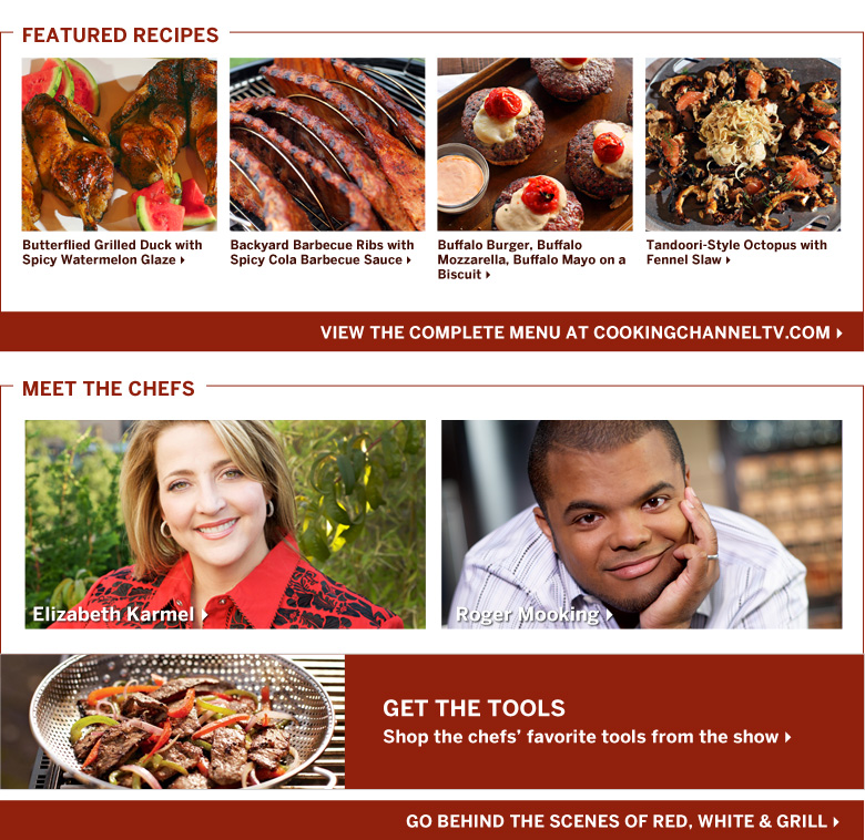 Red, White & GrillWatch a Preview Butterflied Grilled Duck with Spicy Watermelon Glaze Backyard Barbecue Ribs with Spicy Cola Barbecue Sauce Buffalo Burger, Buffalo Mozzarella, Buffalo Mayo on a Biscuit Tandoori-Style Octopus with Fennel Slaw View the Complete Menu at cookingchanneltv.com Elizabeth Karmel Roger Mooking Get the Tools - Shop the chefs' favorite tools from the show Go Behind the Scenes of Red, White & Grill