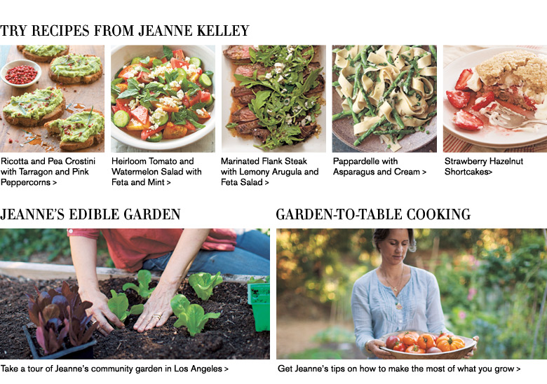 Jeanne Kelley is a cookbook author, food stylist, recipe developer, and frequent contributor to such publications as Cooking Light, Fine Cooking, and Everyday with Rachael Ray. She was a contributing editor at Bon Appétit for over 10 years, and trained at Ecole de Cuisine La Varenne in Paris. She is the author of Salad for Dinner, the acclaimed Blue Eggs and Yellow Tomatoes: Recipes from a Modern Kitchen Garden, and Williams Sonoma Holiday Baking. She and her husband, Martin, a landscape designer, and their two daughters, live in Los Angeles along with a flock of chickens, a beehive, a dog, six fruit trees, and a large plot in the community garden down the street.