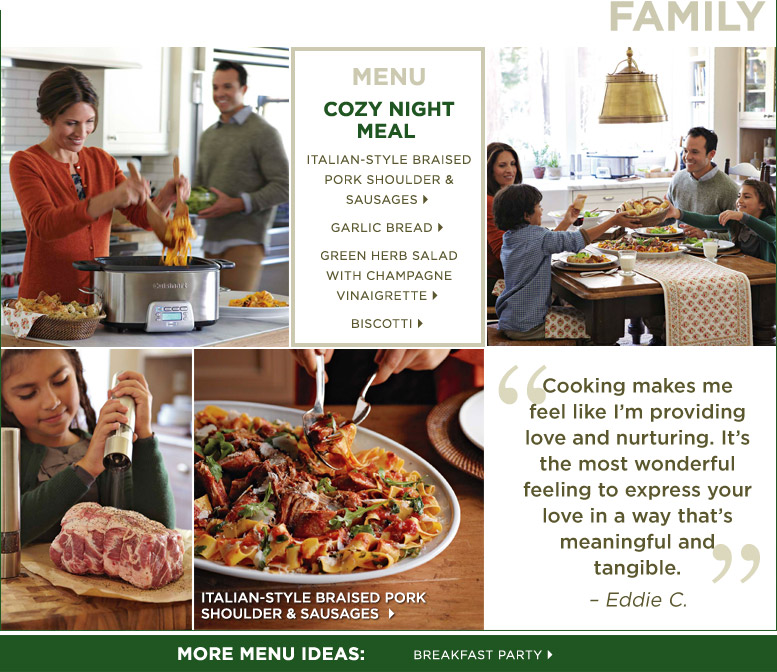 Italian-Style Braised Pork Shoulder & Sausages Garlic Bread Green Herb Salad with Champagne Vinaigrette Biscotti Italian-Style Braised Pork Shoulder & Sausages Breakfast Party Why Do You Cook? Get Inspired By Other Cooks!