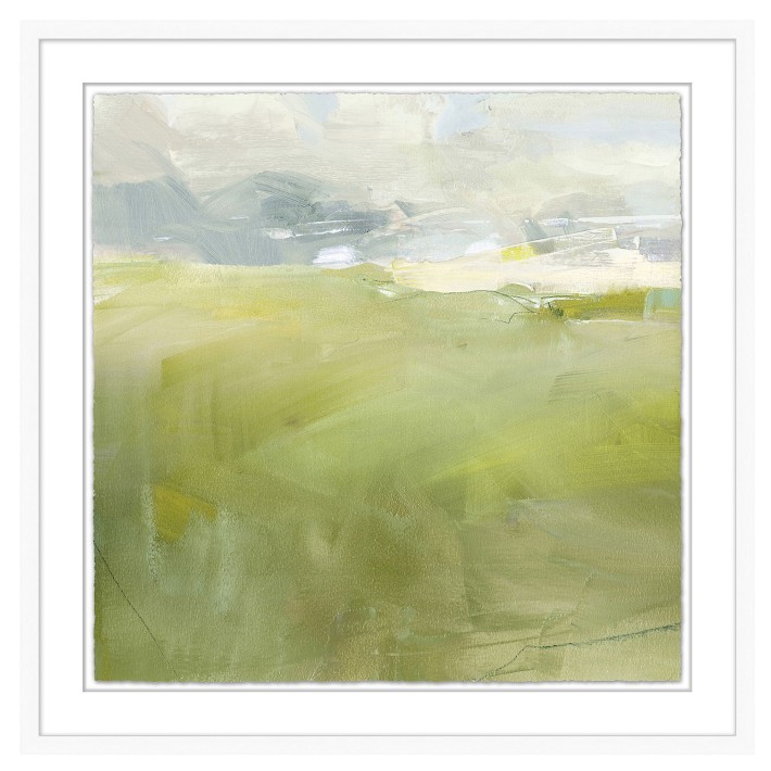 Warm sun shines down on soft green hillsides in this abstract landscape. Set in a modern white shadowbox frame, the giclée reproduction adds softness and serenity to interiors of all styles. Statement-making on its own, the piece is also eye-catching when paired with its companion print.