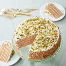 To assemble the cake, place 1 cake round on a parchment-lined baking sheet or a cake circle. Spread about 1/2 cup (4 oz./125 g) of the sour cream frosting evenly over the disk, all the way to the edges (it’s okay if some spills over). Top with another cake round and spread with frosting, then repeat with the remaining cake rounds. Spread the remaining frosting evenly over the top and sides of the cake. Using a small food processor, or a plastic bag and a rolling pin, crush the scrap pieces. Press the crumbs onto the sides of the cake. Sprinkle the pistachios over the top.