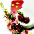 To assemble, carefully unmold the panna cottas onto individual plates. Top each one with some poached cherries, some of the tapioca pearls and some of the cherry poaching liquid. Garnish with crushed salted pistachios, basil buds and a few drops of extra-virgin olive oil. Serves 8.