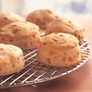 Turn out the dough onto a lightly floured work surface and press together gently. Pat into a circle about 1/2 inch thick. Using a floured 3-inch round biscuit cutter, cut out rounds.