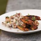Chef Michael Voltaggio offers a new take on potato salad: Fingerling potatoes are cooked on the grill using our specially designed steel grill sauté pan. Then they’re tossed with a yogurt-based dressing that’s enhanced with roasted garlic, sumac and fresh herbs. It’s the perfect side dish for Vadouvan Chicken Wings.