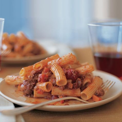 This rich sauce, redolent of red wine and the sweet flavors of pork and fennel, is a classic pairing with rigatoni. This recipe makes enough sauce for dinner tonight plus 2 additional dishes.