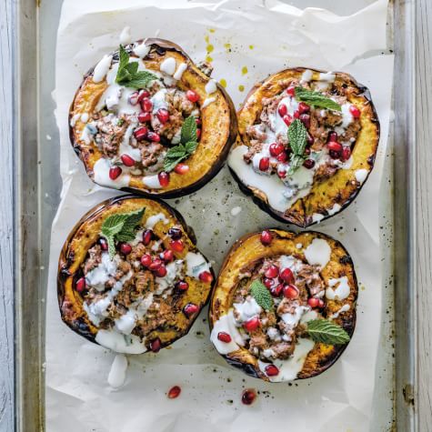 In this sheet pan dinner, roasting the squash halves before filling them with the meat mixture ensures that they will come out of the oven completely tender. Pomegranate seeds add color and crunch to the dish. If you prefer, you can substitute ground beef or even ground chicken or turkey for the lamb.