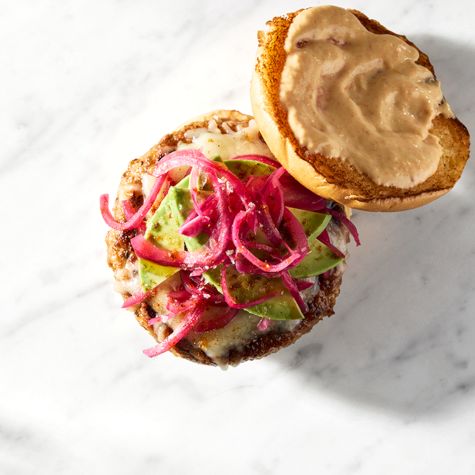 Adobo Chicken Burger with Pickled Red Onions and Avocado
