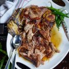 Cover the pan tightly with two layers of aluminum foil, transfer to the oven and cook for 3 hours, carefully loosening the foil and basting the pork with the pan juices every hour. Turn the pork over, cover and cook until very tender, about 4 hours more.