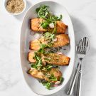 Transfer the salmon to a platter and drizzle with the wasabi aioli or serve on the side as a dipping sauce. Garnish the fish with sesame seeds, green onions, radishes and watercress and serve immediately. Serves 2.