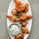 Transfer the wings to a large bowl, add the sauce and toss to coat. Transfer to a platter and sprinkle cilantro leaves on top. Serve immediately with the blue cheese dip alongside. Serves 4.