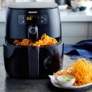 Thin spirals of sweet potato turn wonderfully crisp in an air fryer for an addictive yet healthy snack. Strapped for time? Skip the homemade aioli and season 1 cup (8 oz./250 g) of store-bought mayonnaise with the lemon zest and chopped herbs for a speedy alternative. Leftover aioli is delicious served on sandwiches or as a dipping sauce for crudités.