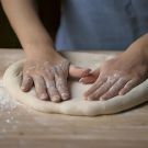 Turn the dough out onto a surface dusted with the remaining flour. Punch down the dough and, using your hand, begin to press it out gently into the desired shape. Then, place one hand in the center of the dough and, with the other hand, pull, lift and stretch the dough, gradually working your way all around the edge, until it is the desired thickness, about 1/4 inch thick for a crusty pizza base and 1/2 inch thick for a softer one. Flip the dough over from time to time as your work with it. (Or roll out the dough with a rolling pin.) The dough should be slightly thinner in the middle than at the edge. Lift the edge of the pizza to form a slight rim.
