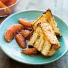 Meanwhile, cut the cake into about 16 slices and place on a rimmed baking sheet. Toast in the oven, turning occasionally, until golden brown, 6 to 10 minutes. Place slices of the cake on individual plates. Spoon the grapefruit and syrup alongside and over the cake and serve immediately. Serves 8 to 10.