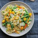 When the water is boiling, stir in the pasta and cook until al dente, 3 to 4 minutes or according to the package instructions. Drain and transfer to a bowl, then toss with the remaining 3 Tbs. olive oil. Add the pasta to the pan with the vegetables and toss well. Transfer to a warmed serving bowl and scatter the tomatoes and basil on top. Sprinkle with the cheese and serve immediately. Serves 6.
